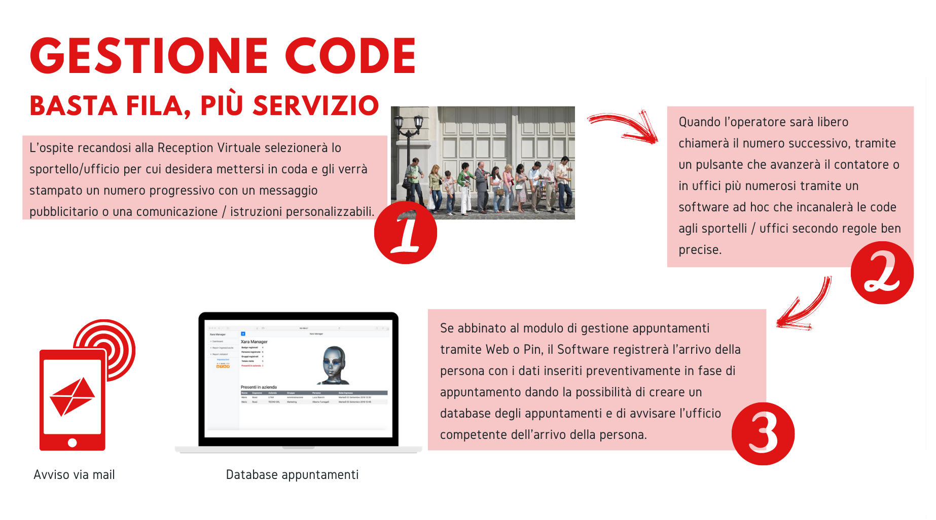 Se abbinato al modulo di gestione appuntamenti tramite Web o Pin, il Software registrerà l’arrivo della persona con i dati inseriti preventivamente in fase di presa-appuntamento dando la possibilità di creare un database degli appuntamenti e di avvisare l’ufficio competente dell’arrivo della persona.
