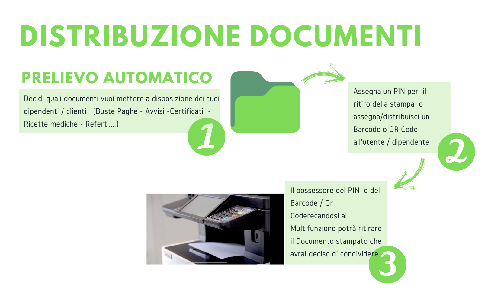 Assegna un PIN per il ritiro della stampa o assegna un Barcode o QR Code all’utente / dipendente Il possessore del PIN o del Barcode / Qr Code recandosi al Multifunzione potrà ritirare il Documento stampato che avrai deciso di condividere.