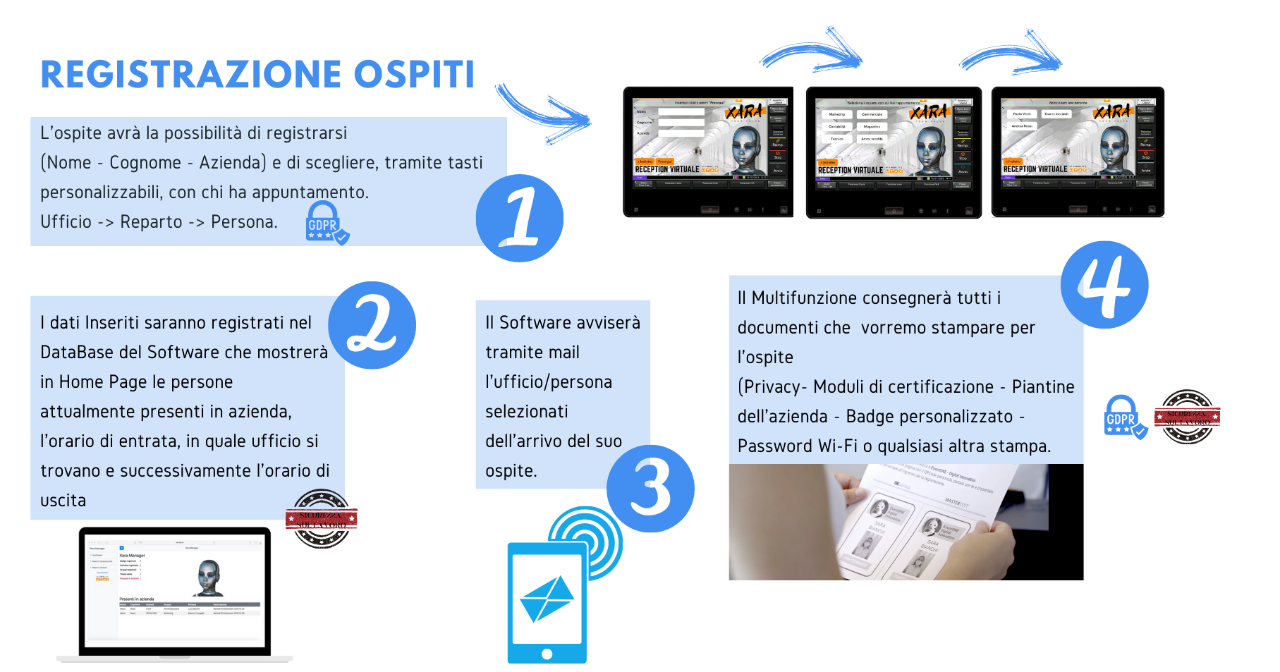 Quando un ospite arriverà in azienda sarà ricevuto dal Monitor interattivo di Xara che gli spiegherà come registrarsi tramite il pannello del Multifunzione. Xara chiederà all’ospite di inserire NOME – COGNOME – AZIENDA per registrarlo all’interno del suo Database, che, essendo la raccolta dei dati in digitale non potrà mai vedere gli altri ospiti registrati precedentemente come spesso capita nel “classico registro cartaceo sulla Reception” e quindi rispettando le attuali normative sulla Privacy, (GDPR).